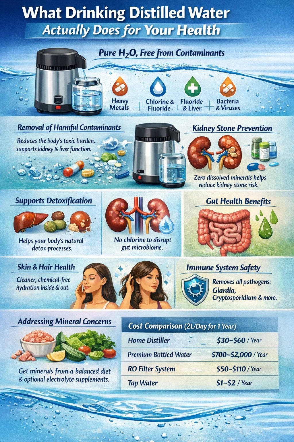 Beneficiile pentru sănătate ale consumului de apă distilată sunt reale, dar sunt în primul rând beneficii ale absenței - absența contaminanților, agenților patogeni, mineralelor nedorite și aditivilor chimici. Acesta nu este un lucru minor. Având în vedere că omul mediu consumă aproximativ 700-1.000 de litri de apă pe an , diferența cumulativă dintre apa curată constant și apa contaminată de-a lungul unei vieți este semnificativă.