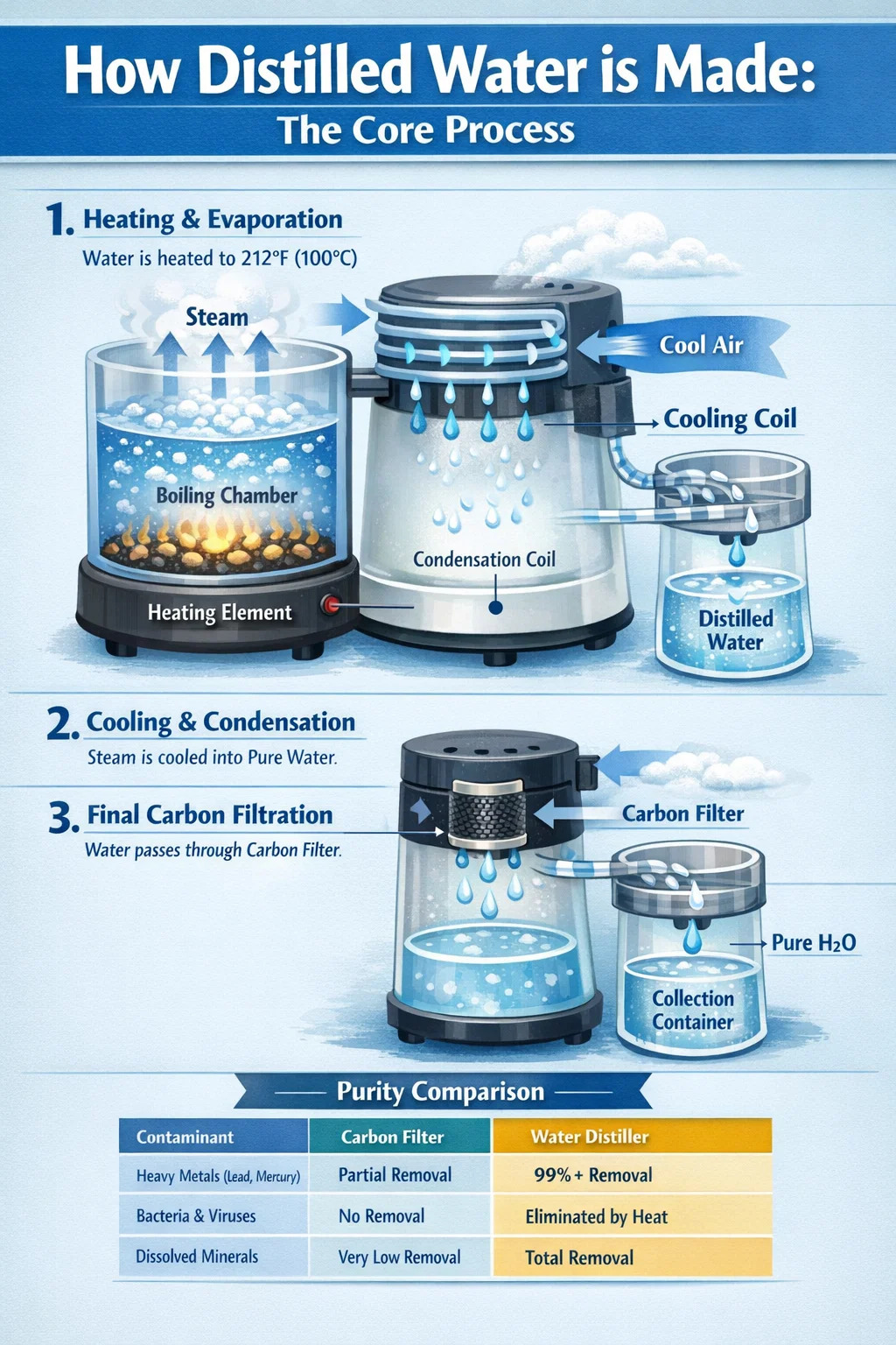 Pentru a răspunde direct la întrebare: apa distilată se face printr-un proces de distilare termică , care implică fierberea apei sursei în abur și apoi răcirea aburului înapoi în stare lichidă într-un recipient separat. Această metodă lasă în urmă efectiv până la 99,9% din totalul solidelor dizolvate (TDS) , inclusiv minerale, metale grele și microorganisme, deoarece acești contaminanți nu se pot transforma în gaz la punctul de fierbere al apei. Prin utilizarea unui specialist distilator de apă , recreați ciclul hidrologic natural - evaporare și condensare - într-o cameră controlată pentru a produce cea mai pură formă de H2O posibilă.