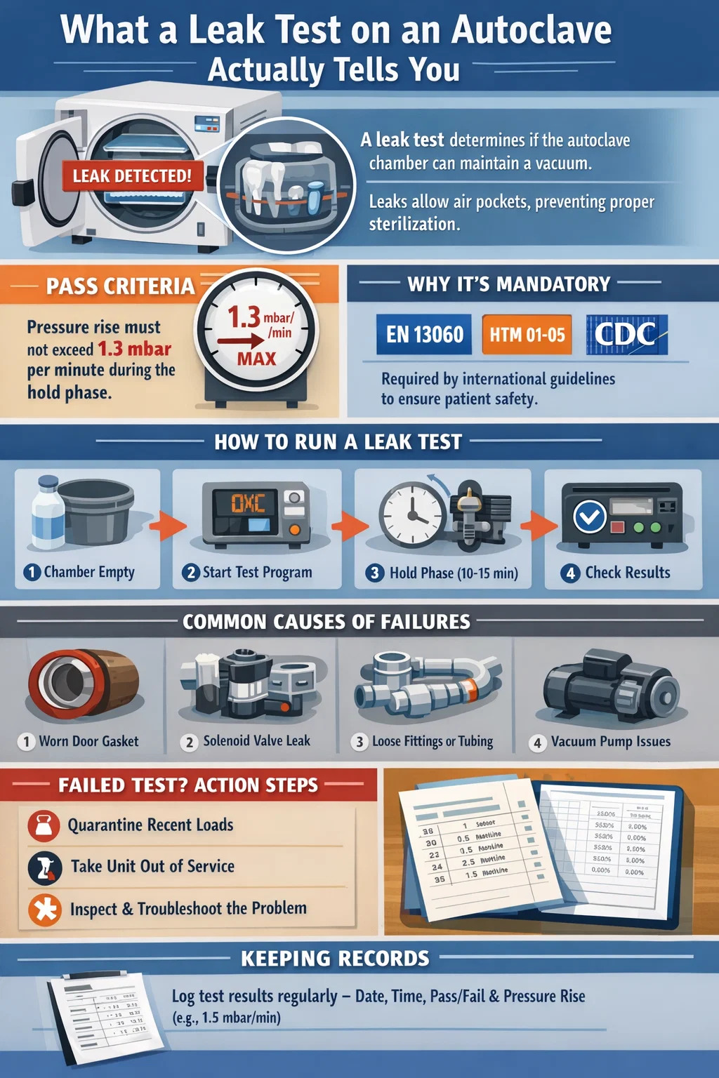 Un test de scurgere pe o autoclavă - numit și test de scurgere în vid sau test de scurgere a aerului - măsoară cât de bine reține camera vidului înainte de începerea ciclului de sterilizare. Dacă camera nu poate menține presiunea negativă într-un prag acceptat, aerul intră în sistem. Pungile de aer împiedică aburul să ajungă uniform pe suprafețele instrumentelor, ceea ce compromite direct eficacitatea sterilizării. Într-o autoclavă dentară, aceasta nu este o problemă minoră de calibrare; este o preocupare pentru siguranța pacientului.